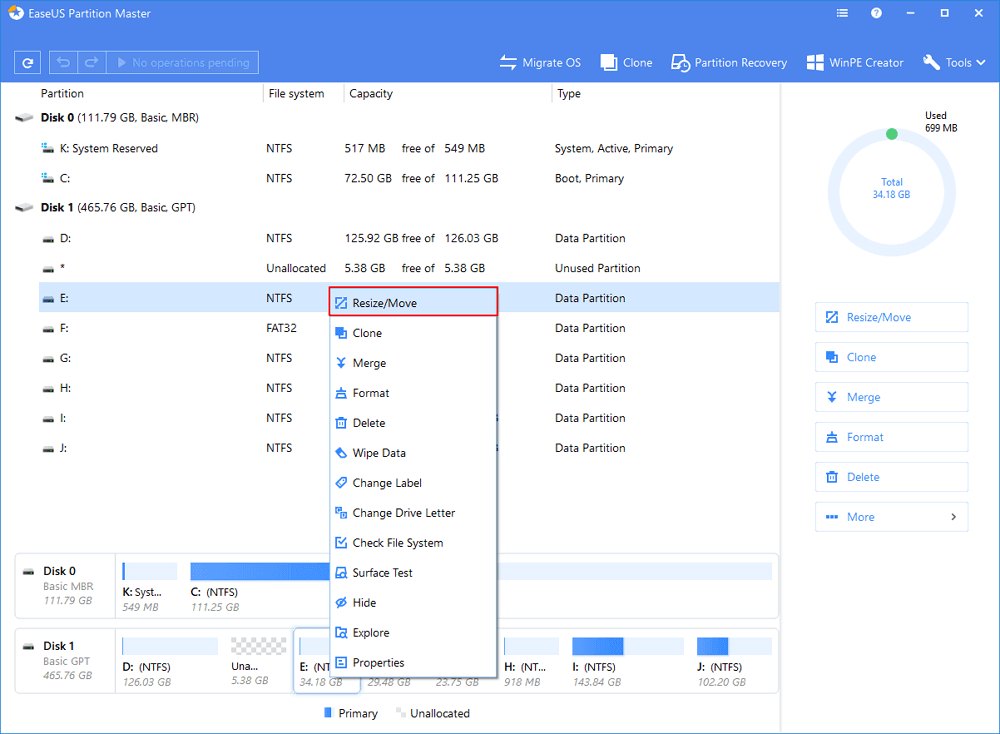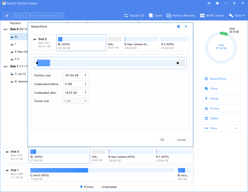 To extend the partition, make sure that there is unallocated space aside (if there isn’t, follow the above steps to create some). In the same way, drag your mouse towards the unallocated space. Click “OK”.
