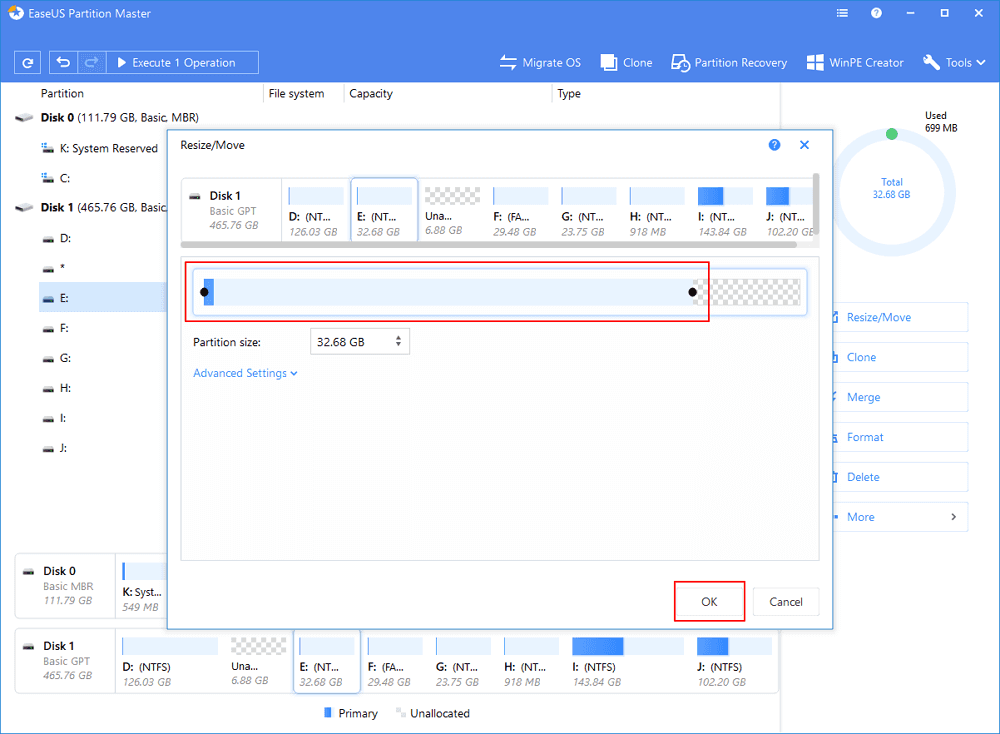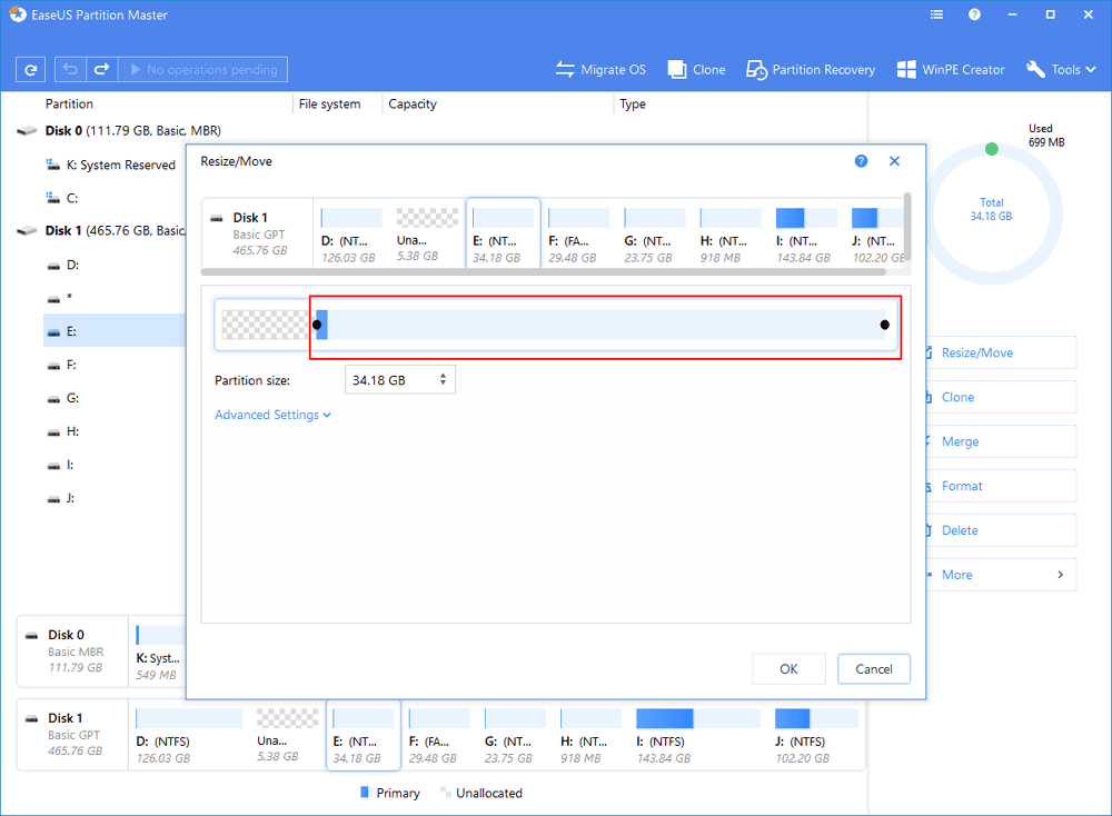 To shrink the partition, simply use your mouse to drag one of its ends into unallocated space. Expand the “Advanced Settings” list, where you can see the exact disk space for each partition. Once done, click “OK”.