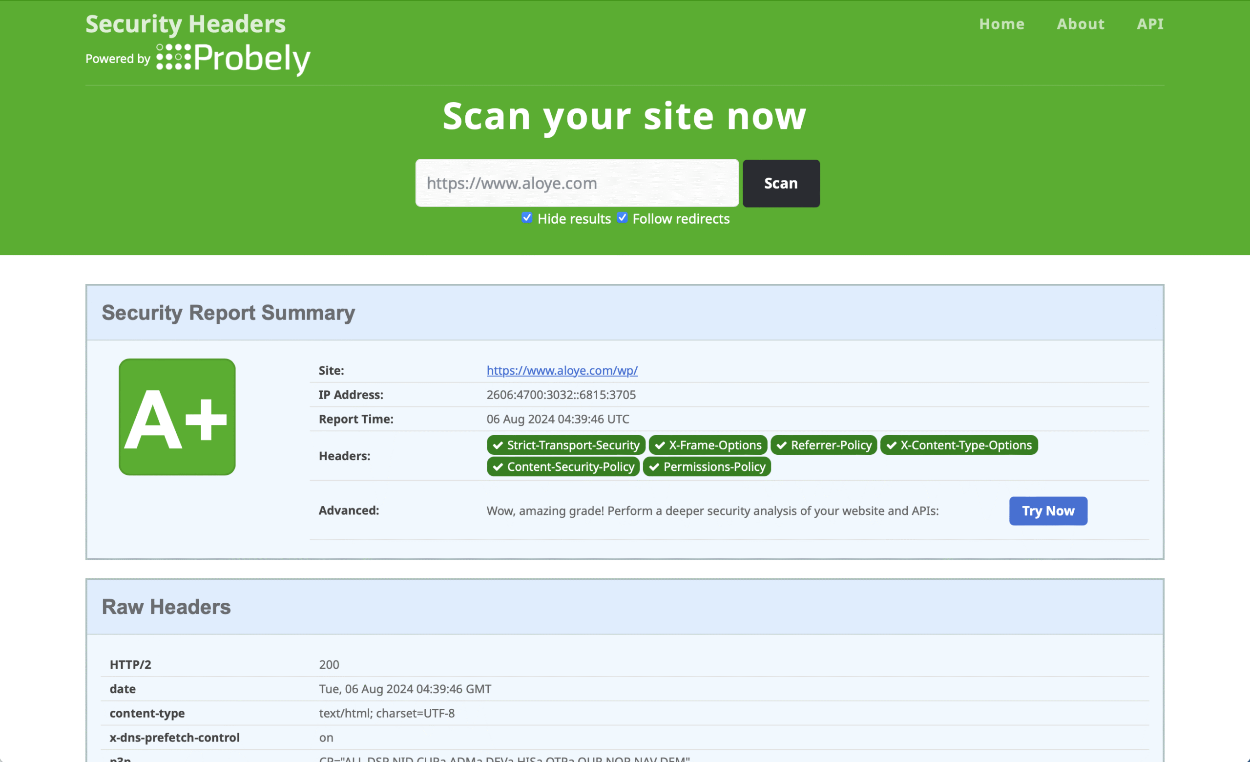 Every Aloye Computer Enterprises LLC Hosted Website has an A+ Security Rating Out-Of-The-Box.